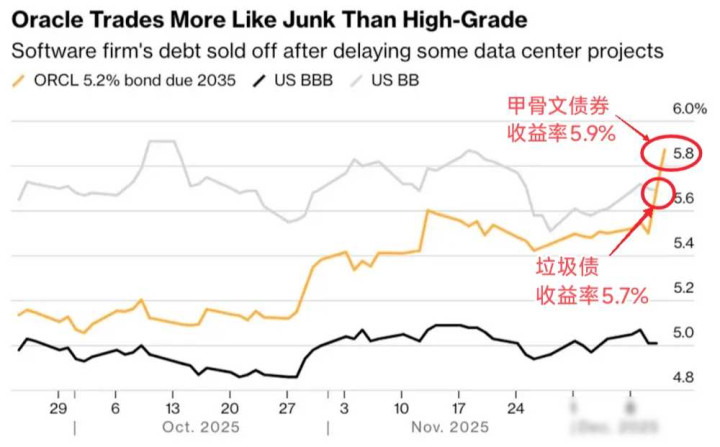 甲骨文欠下的钱已经超过一千亿美元,它那批2035年到期的债券利息涨到5.9%,比不少垃圾债还要高,信用违约互换的价格也冲到17年来最高点,市场不再把甲骨文看作科技公司,而是当成一颗快要爆炸的定时炸弹,过去大家关注AI公司总看它们未来多厉害,如今却在看它们账上有没有现金,能不能还得起债。